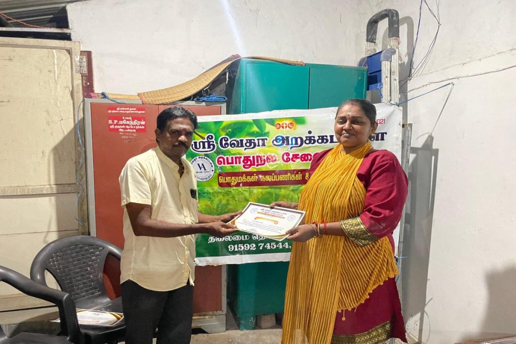 இலவச கண் பரிசோதனை முகாமில் செயலில் பங்கேற்ற தன்னார்வலர்களுக்கு பாராட்டு சான்றிதழ்கள் வழங்கப்பட்டது. அவர்களின் சமூக பங்களிப்பு மதிப்பிடப்பட்டது.
