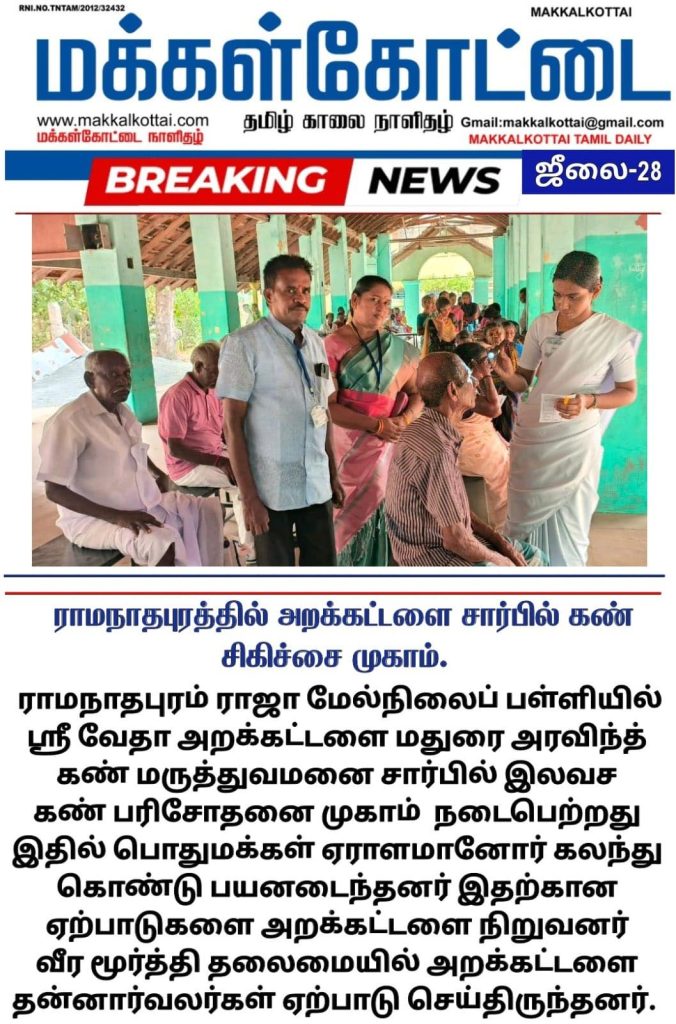 ஸ்ரீ வேதா அறக்கட்டளையின் நாண்காம் ஆண்டை முன்னிட்டு அரவிந்த் கண் மருத்துவமனை இணைந்து இலவச கண் பரிசோதனை மற்றும் சிகிச்சை முகாம் நடத்தப்பட்டது.